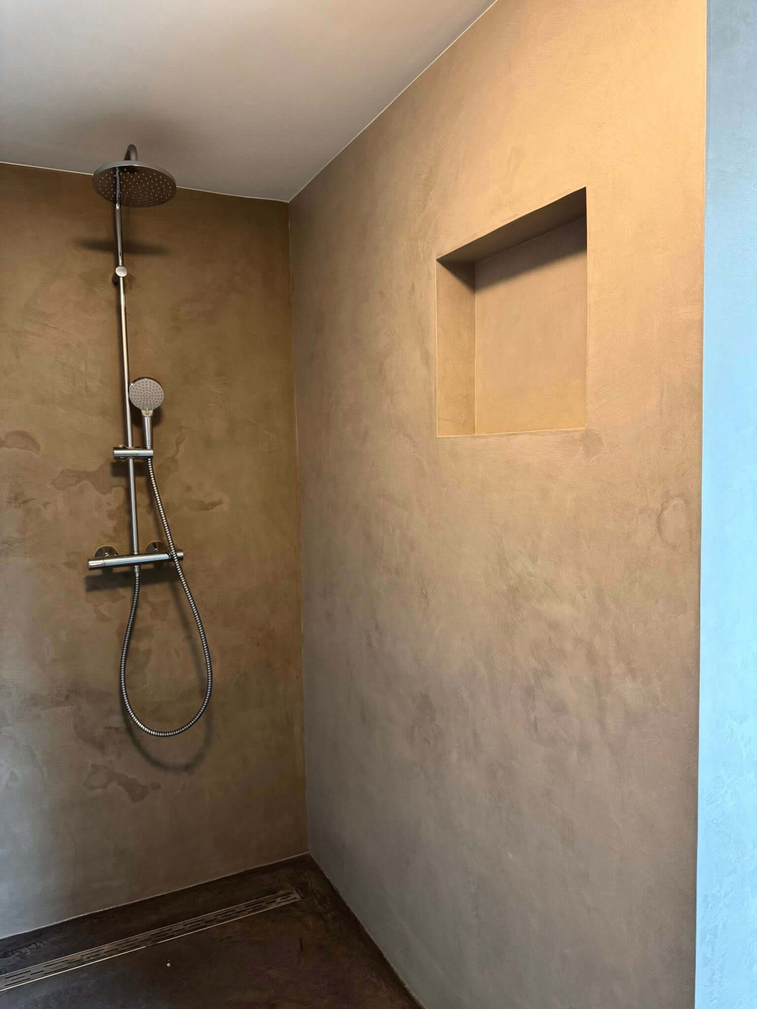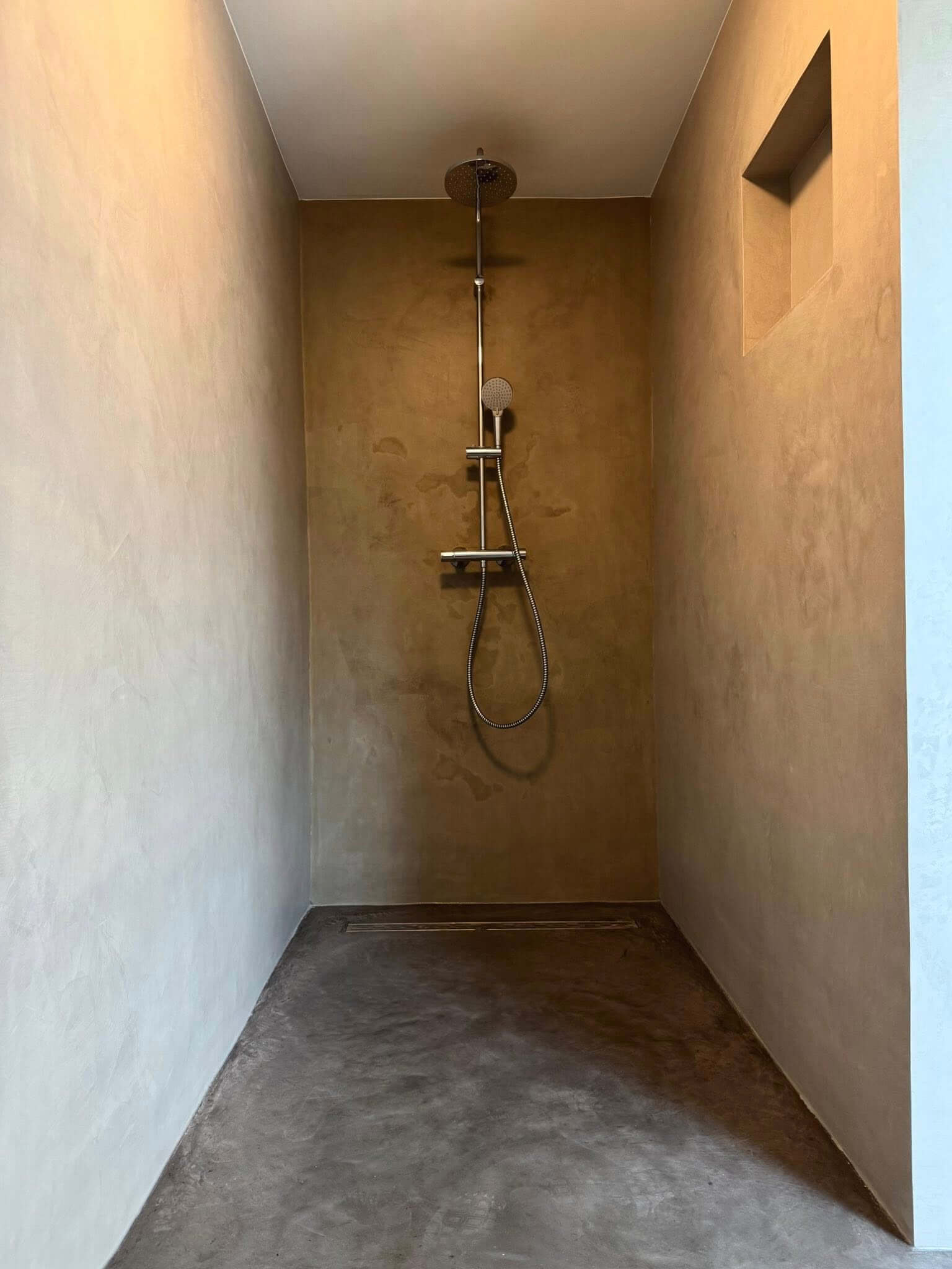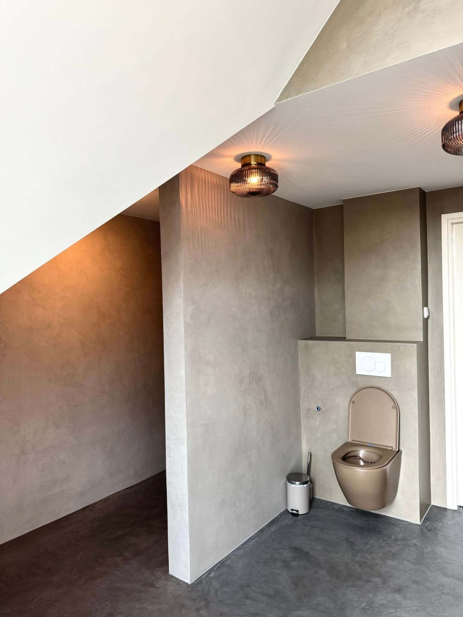 In Groningen hebben wij een complete badkamerrenovatie gerealiseerd met een uitgesproken en persoonlijk ontwerp. De klant had een duidelijke visie: een warme, natuurlijke uitstraling met aardse en beige tinten, gecombineerd met diverse hoogwaardige materialen. Een belangrijk onderdeel van dit project was het aanbrengen van Beton Ciré op de wanden, wat zorgt voor een naadloze, moderne afwerking met een zachte en natuurlijke uitstraling die perfect aansluit bij het totaalconcept.